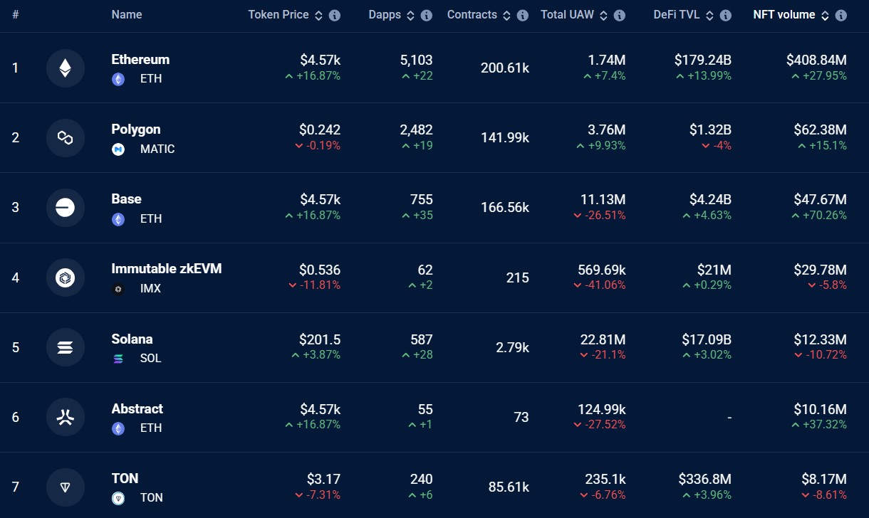 According to decentralized application data aggregator DappRadar, Base’s NFT volume reached $47.67 million, marking a 70% rise in a month. This surge propelled the network ahead of several competitors in the NFT sector, including Immutable zkEVM and Solana, which now hold the fourth and fifth ranks by 30-day volume.