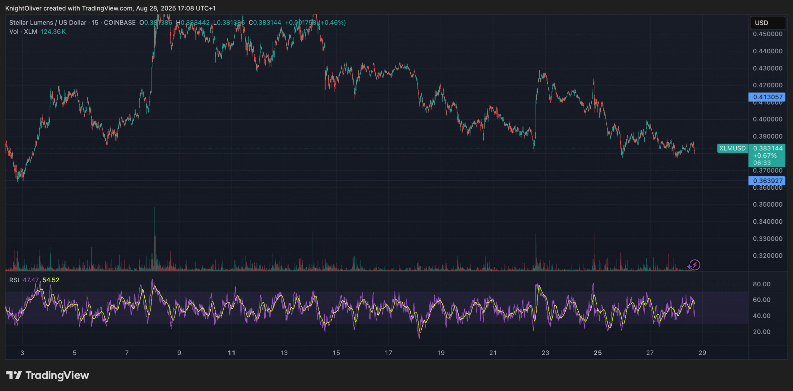 The final trading hour on Aug. 28 showcased this momentum, as XLM rose from $0.38 to $0.39 in less than an hour. Analysts remark that this upward move aligned with increased interest from corporate treasury departments exploring decentralized settlement protocols.