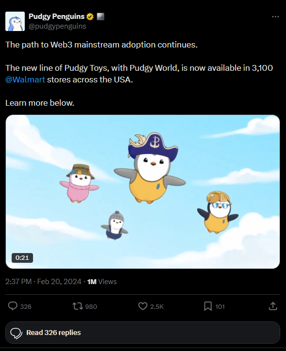 Crypto companies mastered online marketing, influencer hype, and Discord engagement, but they never broke into the real world. No mass market hardware. No physical retail presence. No products sitting next to gum, lighters, gift cards, or energy shots. No way for the average consumer to encounter NFTs as anything except a confusing digital abstraction. Unlike Pudgy Penguins, with a successful show at the Licensing Show in Las Vegas and successful retail distribution platform, Pudgy Penguins has launched in over 3,100 Walmart Locations Nationwide. A major milestone for the NFT industry and NFT collectibles in establishing a physical retail presence.